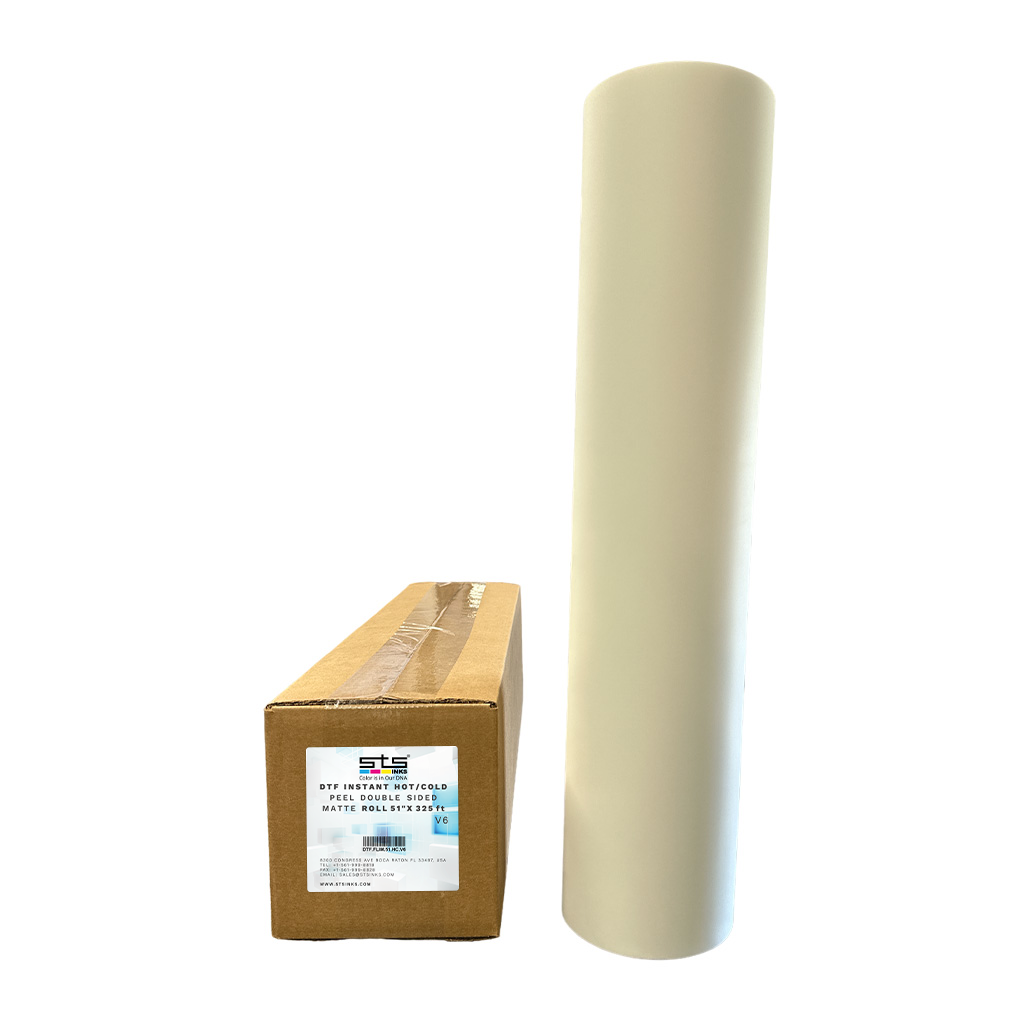 Available in rolls and sheets. STS’s specially formulated coated PET film for DTF printing provides for a vivid printed image with smooth gradient without background artifacts.
