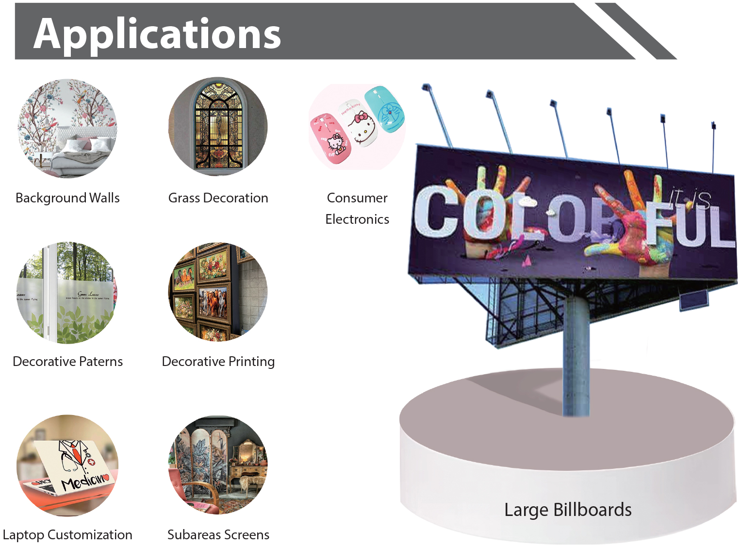 - Printing Media: Glass, Ceramic, Metal, PVC Board, Acrylic, Wood, PU, Wallpaper etc.